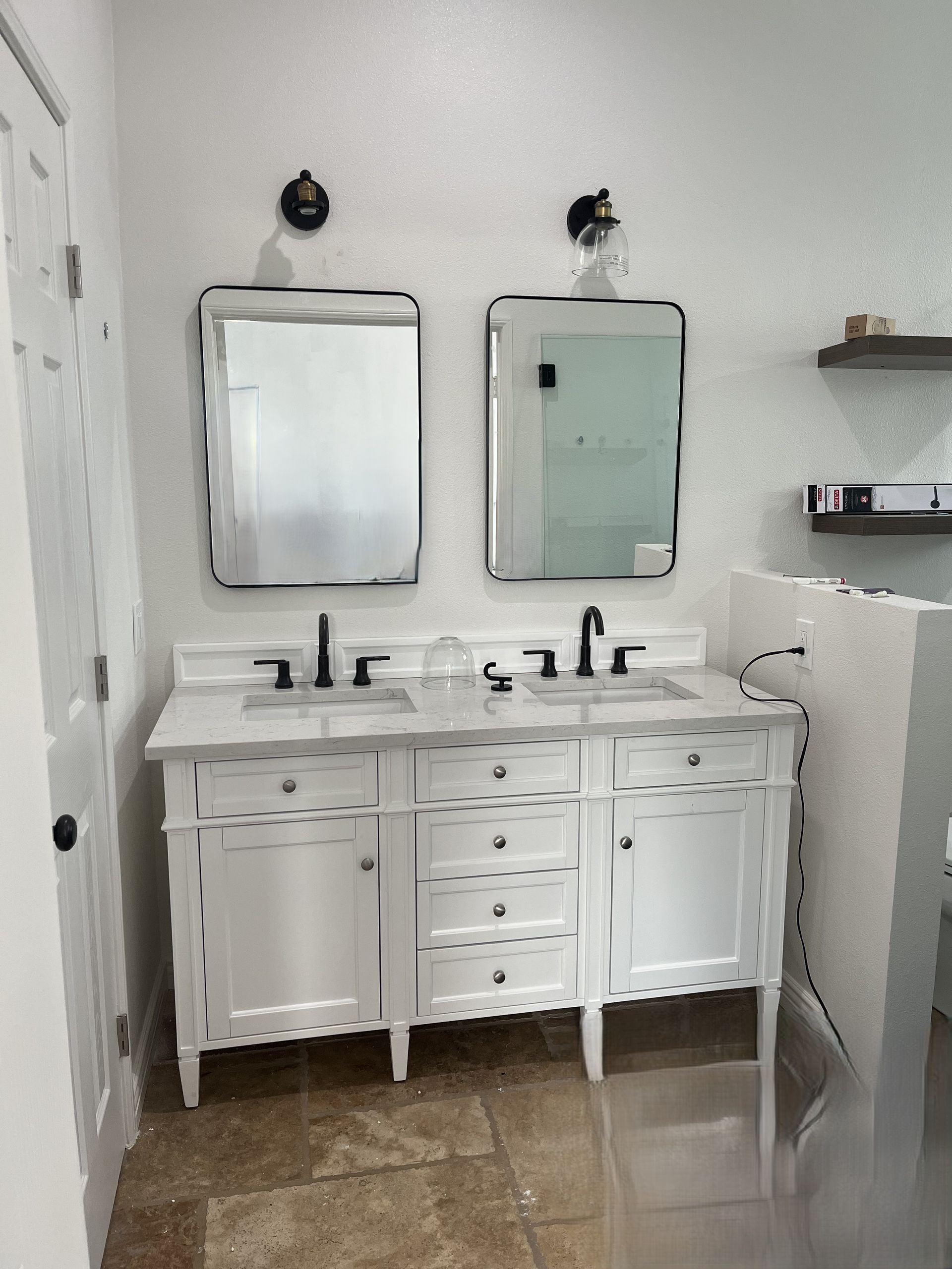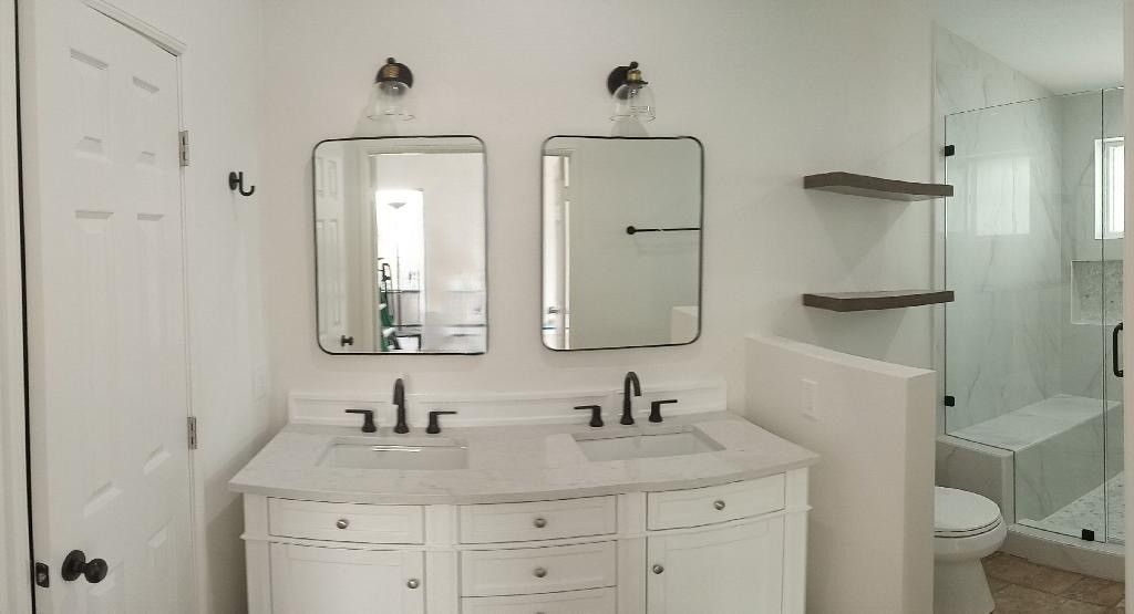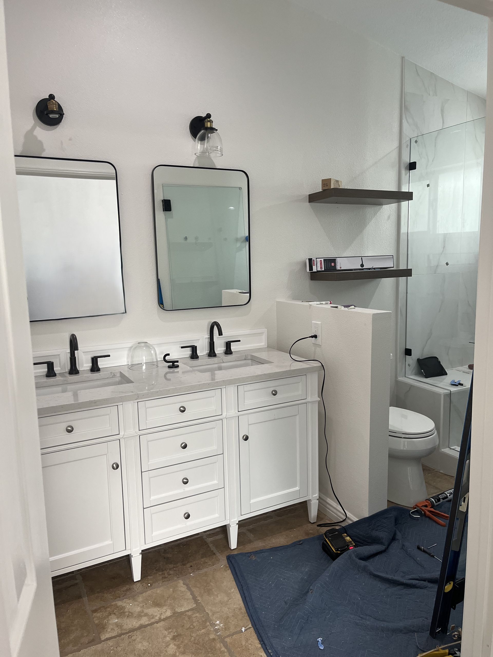this project also included fan, glass door, new outlets, custom cabinets, toilet, sinks, paint, tile, floor, and all finishes.